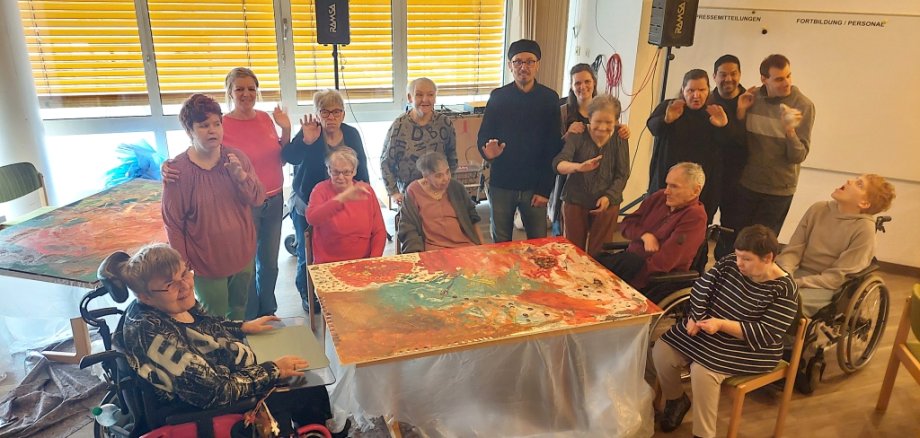 Der praktische Teil des Projekts begann mit einem Workshop-Tag am Freitag, den 13. März 2026. Die St. Paulus Stiftler gestalteten unter fachmännischer Regie des Künstlers Francesco Jorio zunächst die vier großen, jeweils 1 x 1,5 Meter umfassenden Gipsfaserplatten mit Acryl-Farben, die den Hintergrund des späteren Kunstwerks bilden. Die Beteiligung war groß, die Freude am gemeinsamen Tun spürbar. Rund 40 Bewohner ließen es sich nicht nehmen, bei der Schaffung dieses bleibenden Kunstwerks aktiv dabei zu sein. Im Anschluss werden die Platten in der Villa Wieser von den beiden Künstlern weiterbearbeitet – Schicht für Schicht, Strich für Strich. Im nächsten Schritt wird das Bewohner-Motiv integriert, bevor die historischen und thematischen Elemente vervollständigt werden.