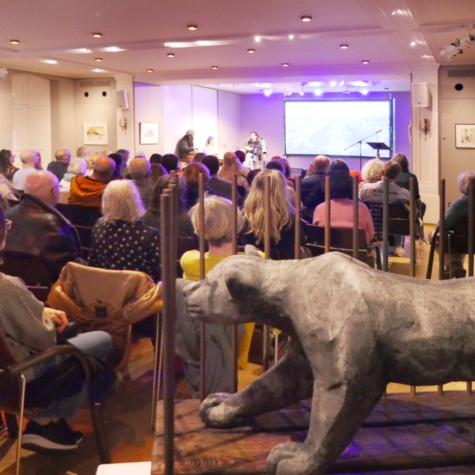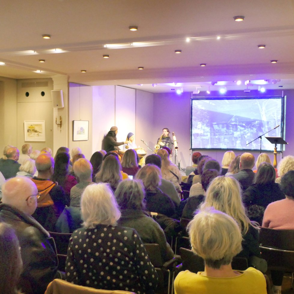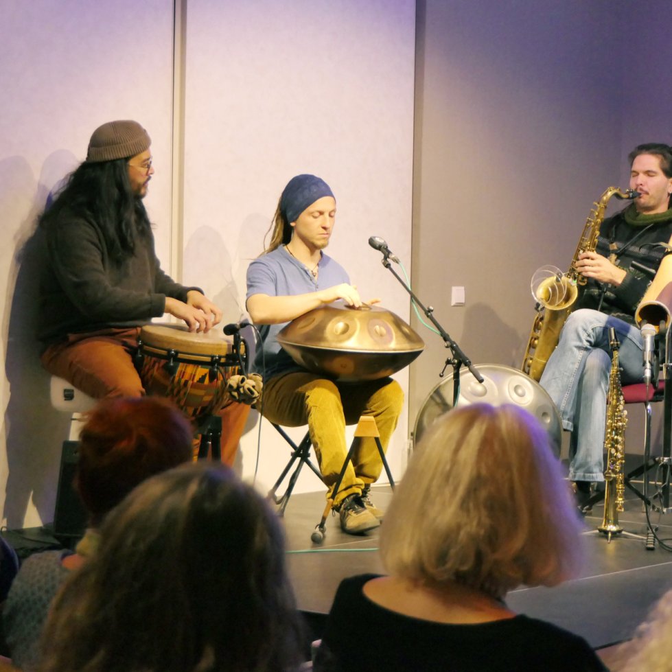 Musikalisch gestaltete das Trio ElJeKo aus Landau den Abend und schuf mit freier Improvisation einzigartige Klangräume. Mit Handpan, Djembé, Saxophon und Didgeridoo begeisterten die Musiker das Publikum und luden dazu ein, eigene Gedanken und Emotionen zu den gehörten Texten und gesehenen Bildern zu entfalten. Die intuitive, lebendige Musik verschmolz mit Wort und Bild zu einem Gesamterlebnis, das weit über eine klassische Lesung hinausging.
