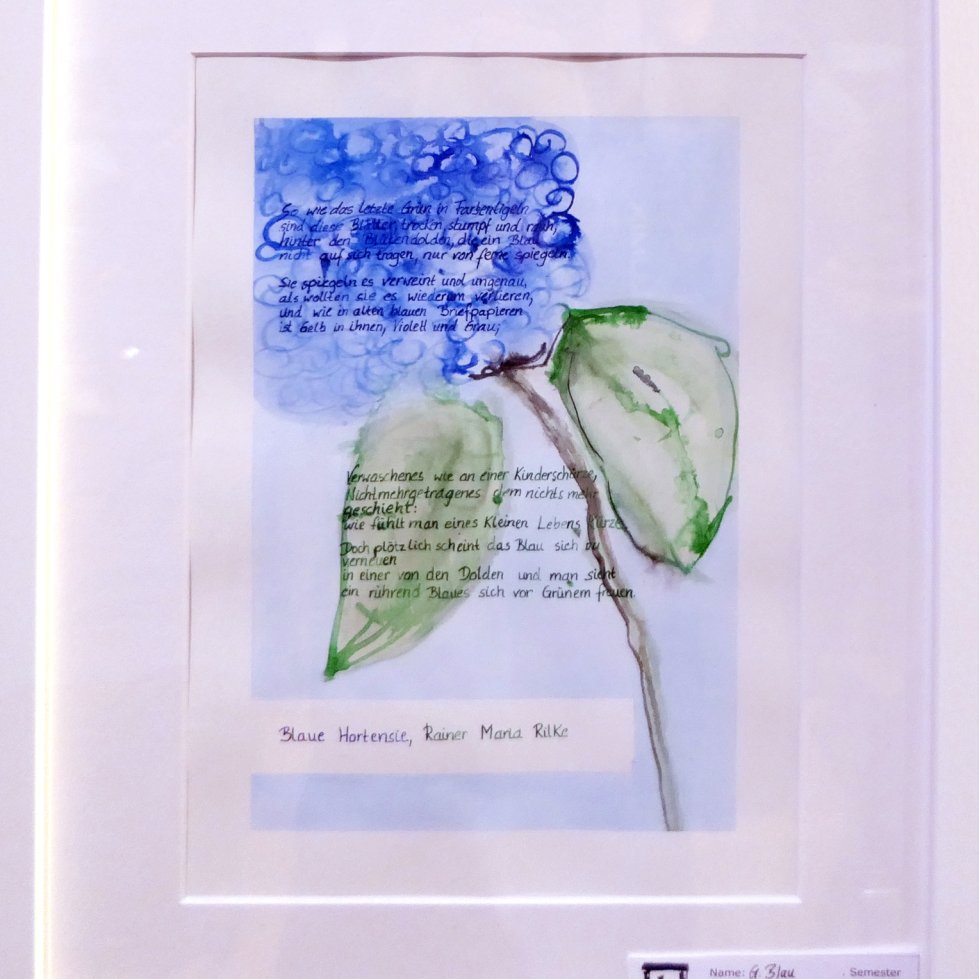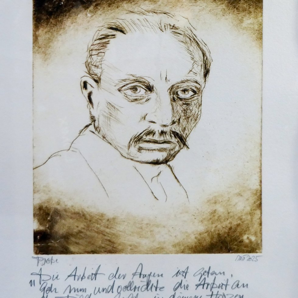 Anlässlich des 150. Geburtstags von Rainer Maria Rilke im Jahr 2025 widmete sich die Kunstschule in einem intermedialen und kursübergreifenden Projekt dem großen Dichter des 20. Jahrhunderts. Rilke selbst pflegte enge Verbindungen zur bildenden Kunst und zu zahlreichen Künstlern, weshalb die Kunstschule der ideale Ort war, sich – gewissermaßen vice versa – mit seinem Werk auseinanderzusetzen. Ausgangspunkt des Projekts war die Schreibwerkstatt „Atelier der Worte“, doch auch die Kurse Freie Malerei, Bildhauerei, Aquarell, Radierung und Portraitzeichnen beschäftigten sich intensiv mit Rilkes Schaffen. Grundlage bildete ein umfangreicher Reader mit Texten und Materialien zu Rilkes Pariser Jahren. In dieser Zeit setzte er sich besonders stark mit der bildenden Kunst auseinander: Er arbeitete zeitweise bei und für Auguste Rodin und tauschte sich in Briefen mit seiner Frau über die Werke des kurz zuvor verstorbenen Malers Paul Cézanne aus.