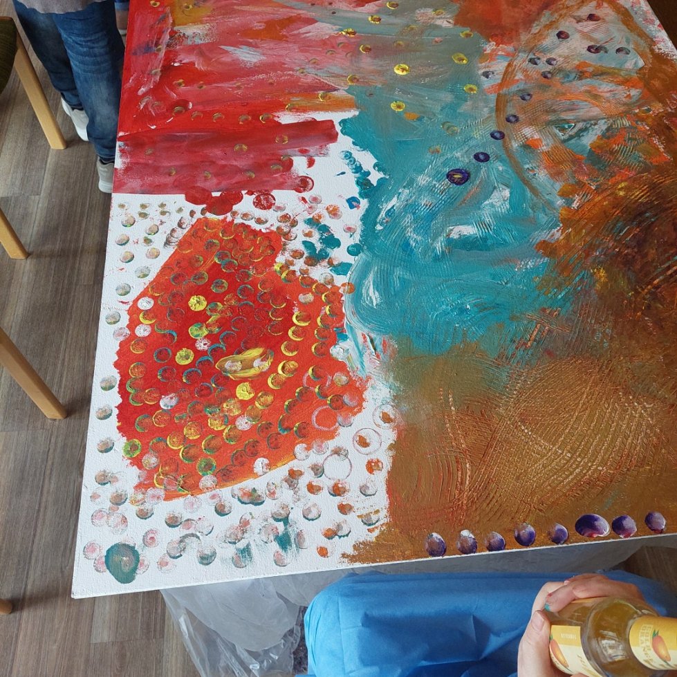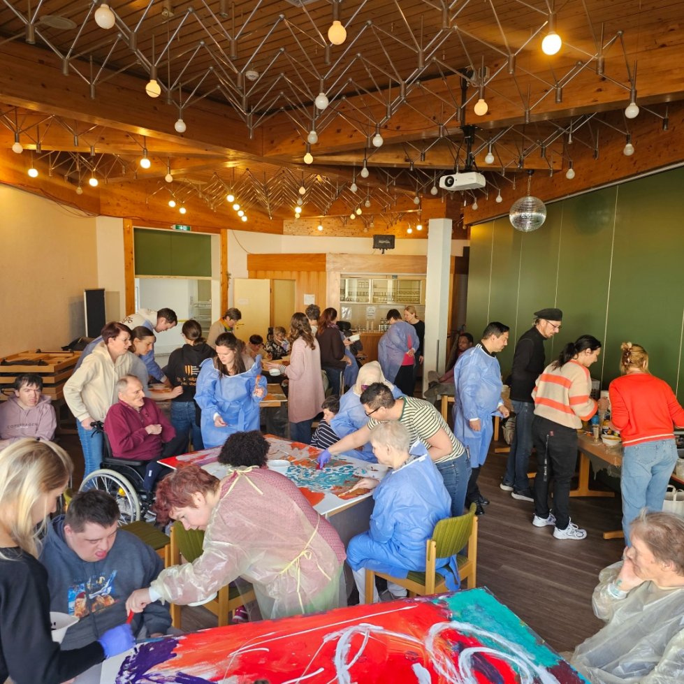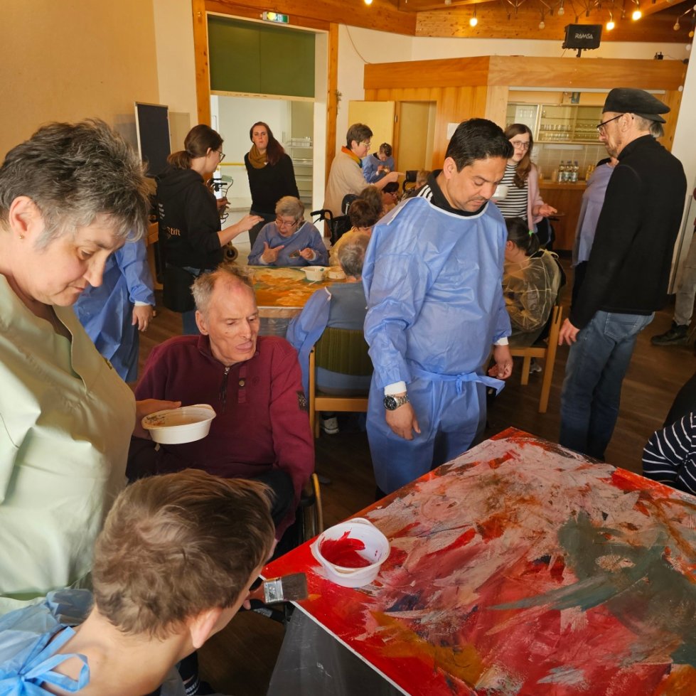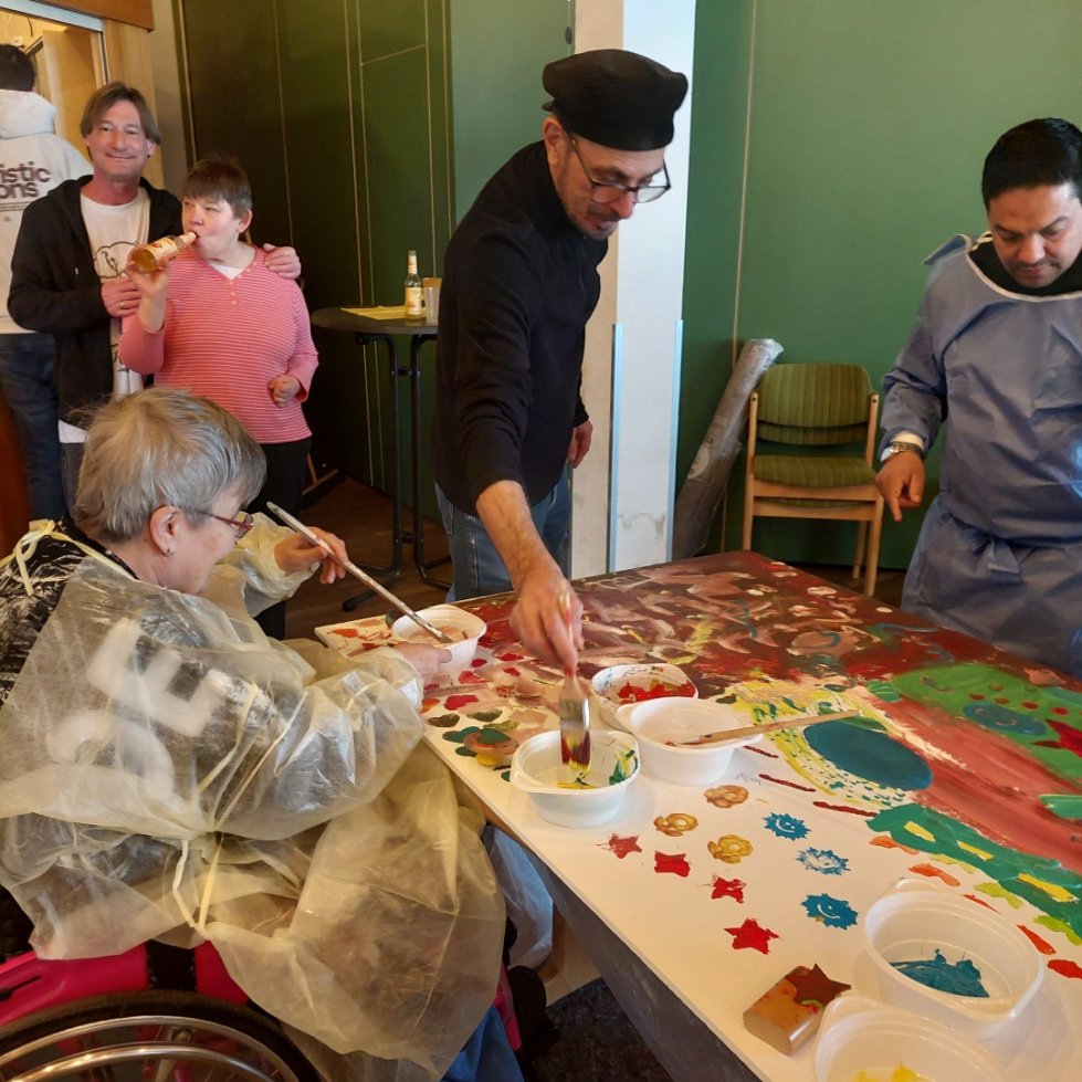 Der praktische Teil des Projekts begann mit einem Workshop-Tag am Freitag, den 13. März 2026. Die St. Paulus Stiftler gestalteten unter fachmännischer Regie des Künstlers Francesco Jorio zunächst die vier großen, jeweils 1 x 1,5 Meter umfassenden Gipsfaserplatten mit Acryl-Farben, die den Hintergrund des späteren Kunstwerks bilden. Die Beteiligung war groß, die Freude am gemeinsamen Tun spürbar. Rund 40 Bewohner ließen es sich nicht nehmen, bei der Schaffung dieses bleibenden Kunstwerks aktiv dabei zu sein. Im Anschluss werden die Platten in der Villa Wieser von den beiden Künstlern weiterbearbeitet – Schicht für Schicht, Strich für Strich. Im nächsten Schritt wird das Bewohner-Motiv integriert, bevor die historischen und thematischen Elemente vervollständigt werden.Ein Projekt, das verbindet